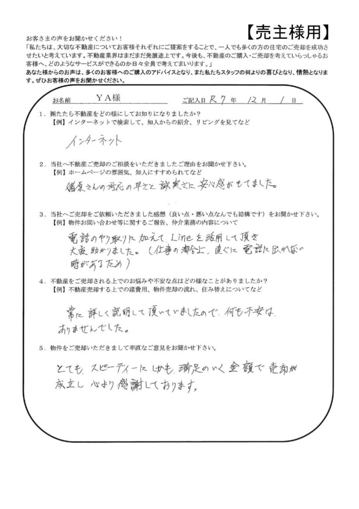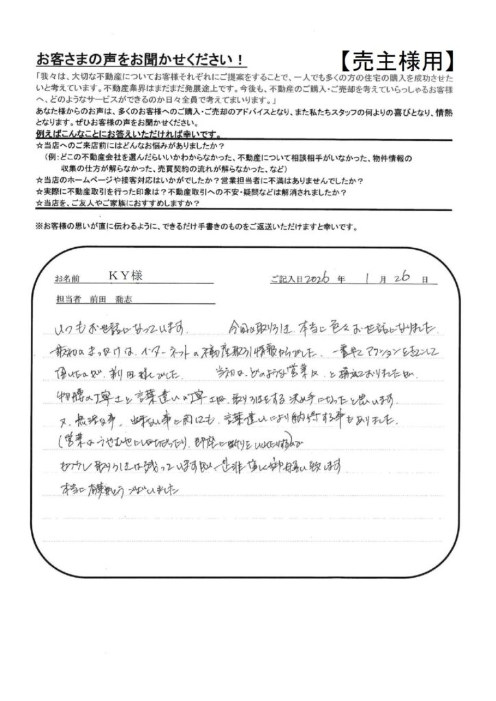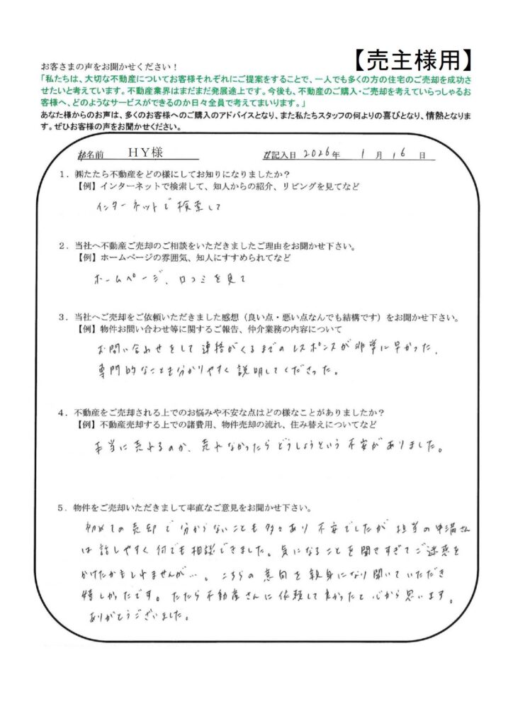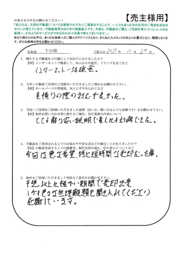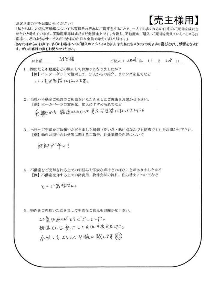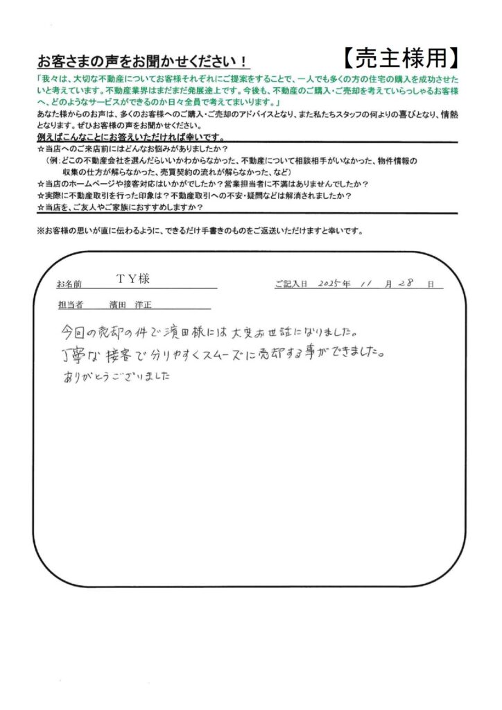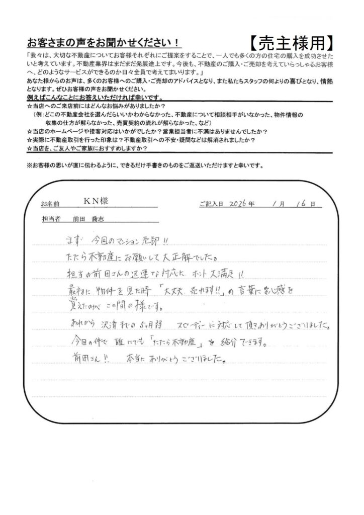 たたら不動産の仕事の早さには大変おどろきました。【YI様】」